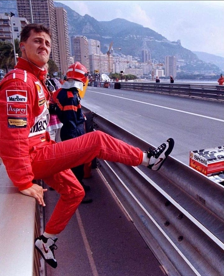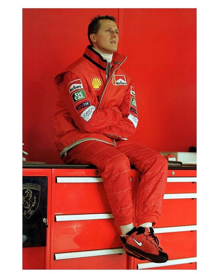 In the late 1990s, the company supplied racing shoes to Michael Schumacher and even produced a lifestyle adaptation — the Air Zoom Schu — attempting to translate its Air Jordan playbook into racing culture.
