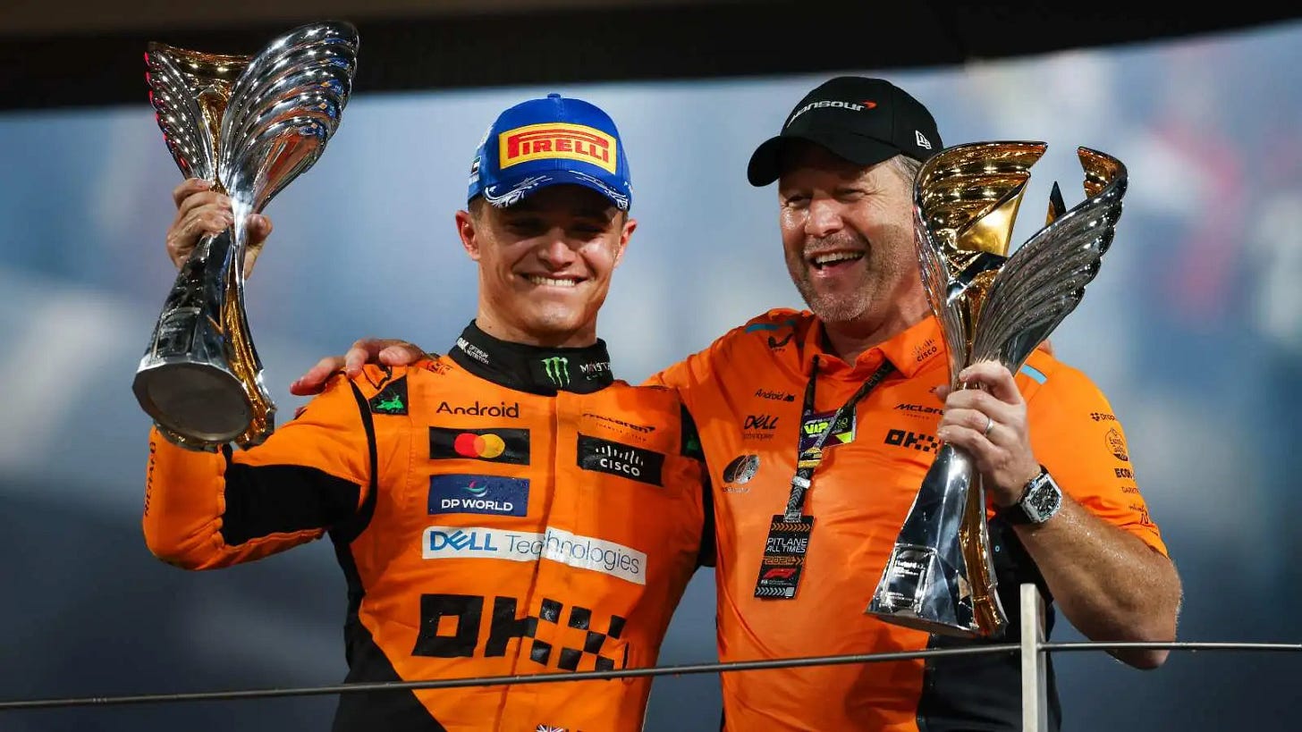 In 2025, they did it again. Lando Norris won the drivers’ title. Oscar Piastri finished second, a driver Brown had audaciously poached from Alpine in 2022 after Alpine publicly announced him as their 2023 driver, only for Piastri to immediately post on social media that he had not signed any such contract. McLaren started the season by winning 12 of the first 15 Grands Prix (14 total wins for the year), clinching the constructors’ title with six rounds remaining and equalling the record for the earliest championship victory in history. It was McLaren’s first back-to-back title since 1990 and 1991, a gap of 33 years.